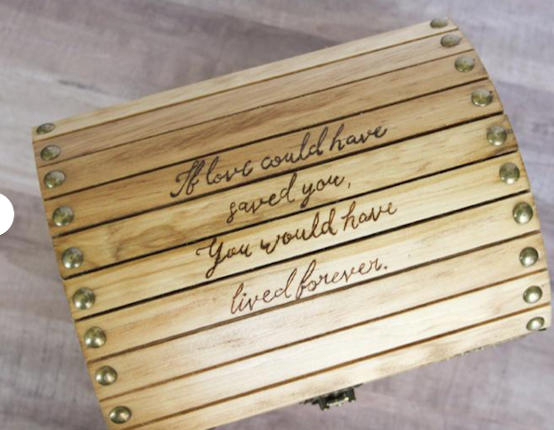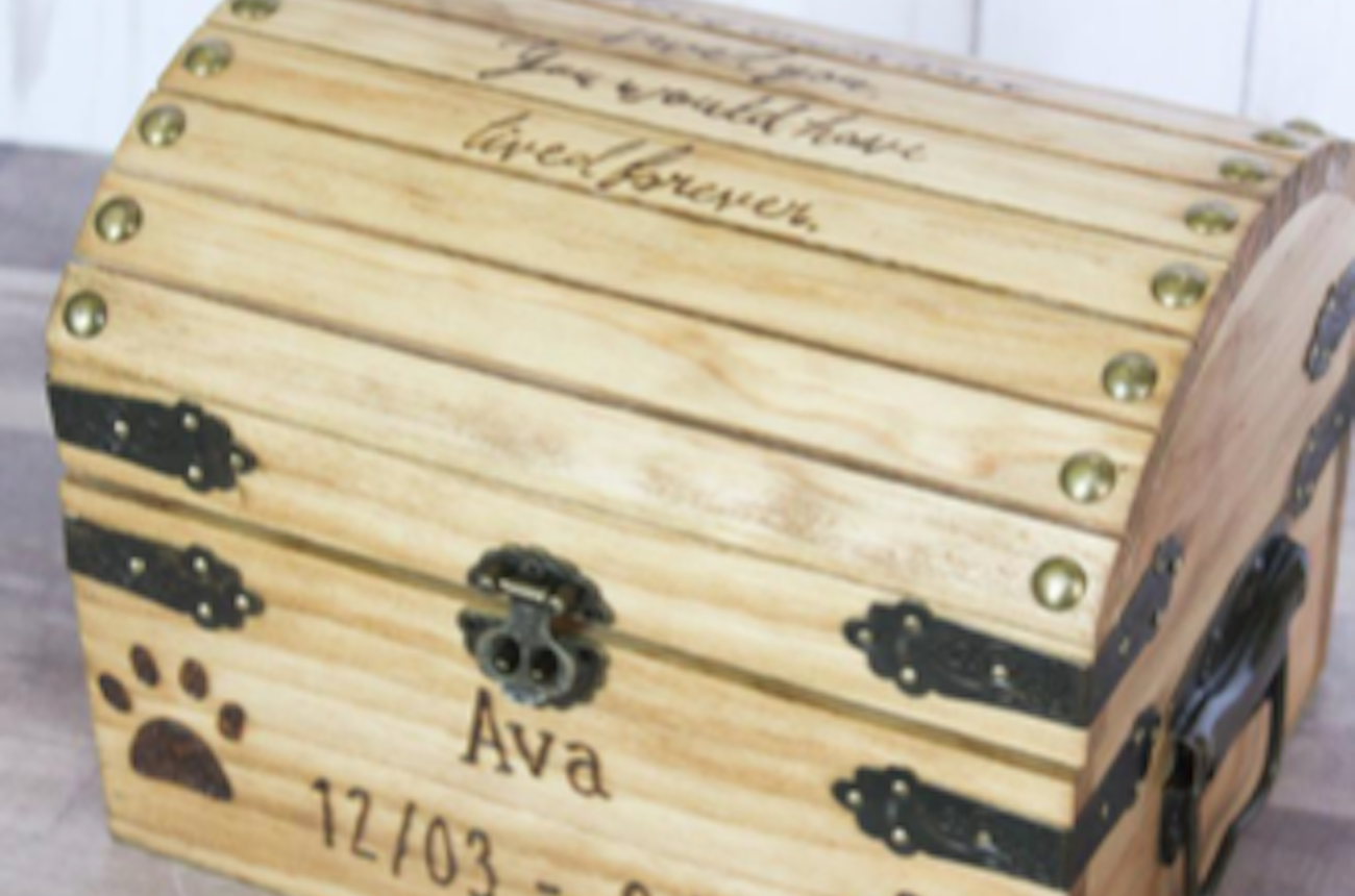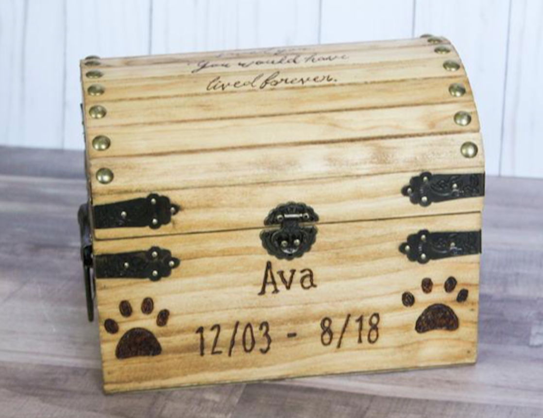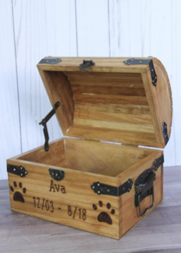 Diese Holzkiste wird beim Kauf mit dem Namen Ihres Haustieres personalisiert. Eine großartige Möglichkeit, Erinnerungen an Ihren besten Freund zu bewahren, sowie ein wunderbares Geschenk für alle, die den Verlust eines Haustieres erlebt haben.