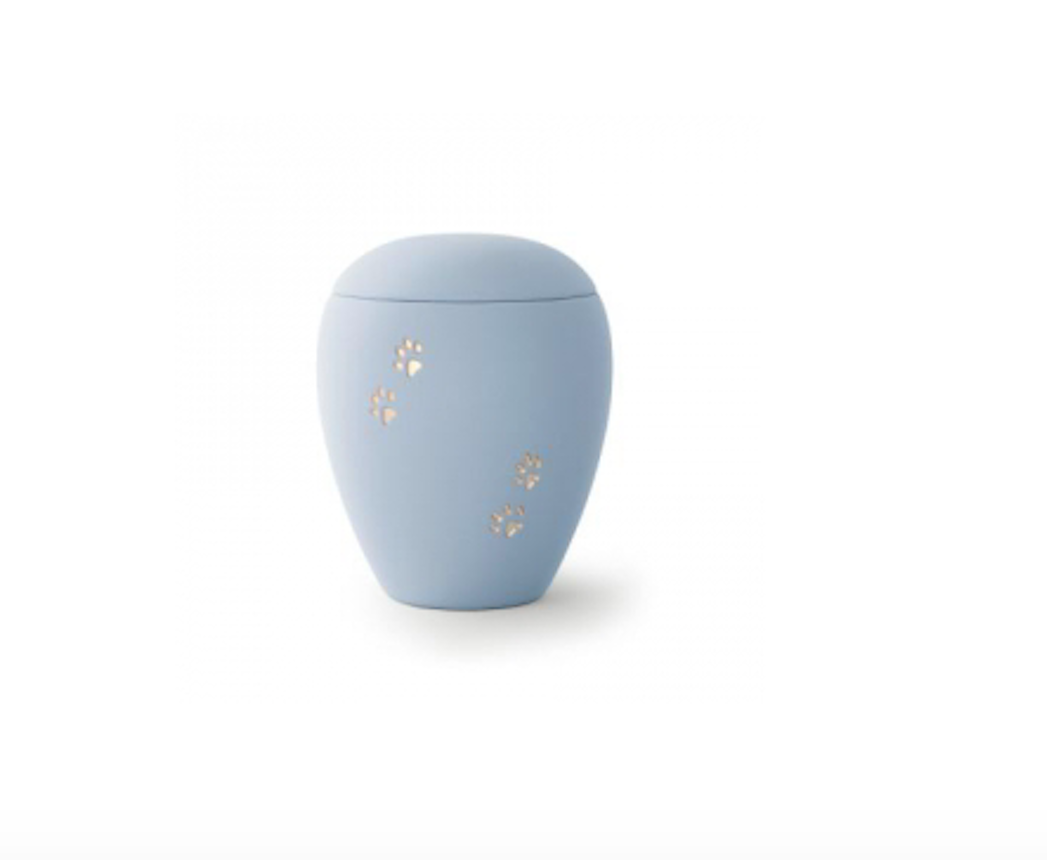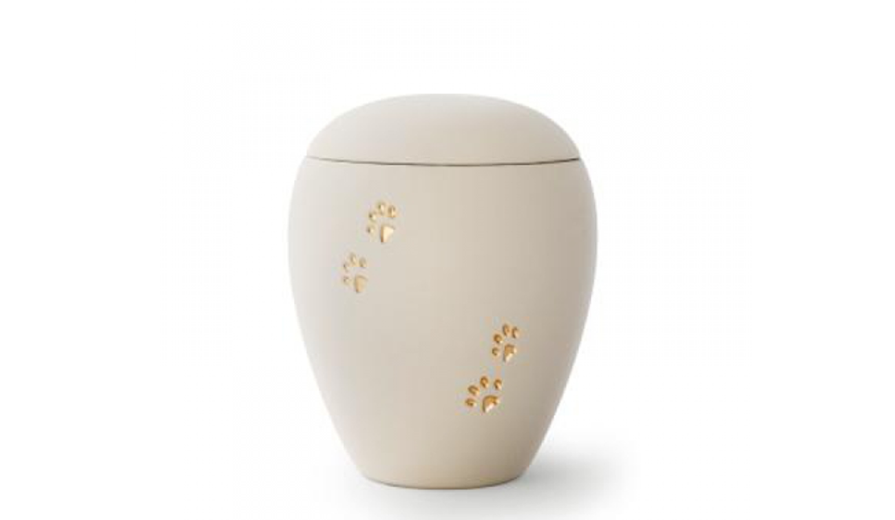Die Urnen der Edition Siena besitzen eine samtene Oberfläche mit goldenen Relief-Pfötchen.